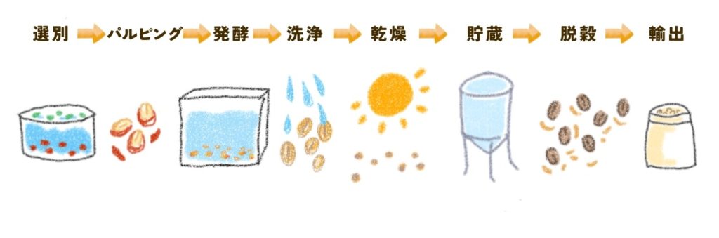 コーヒー豆を乾燥させる前に、水を使いパーチメント(内果皮)と粘液質(ミューシレージ)を全て取り除く精製方法です。主に中南米(コロンビア・グアテマラ)、アフリカ(ケニア・エチオピア)など、広く採用されています。