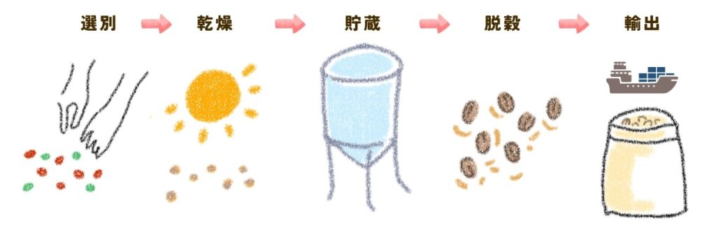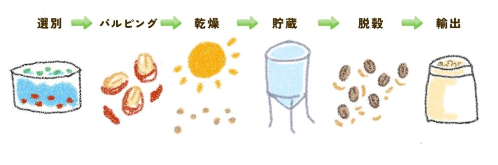 【果肉除去(機械)→1次乾燥(ミューシレージついたまま)→脱穀(水分含んだまま)→2次乾燥】